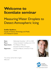 Welcome to licentiate seminar "Measuring Water Droplets to Detect Atmospheric Icing" presented by PhD-student Staffan Rydblom at the STC Research Centre.