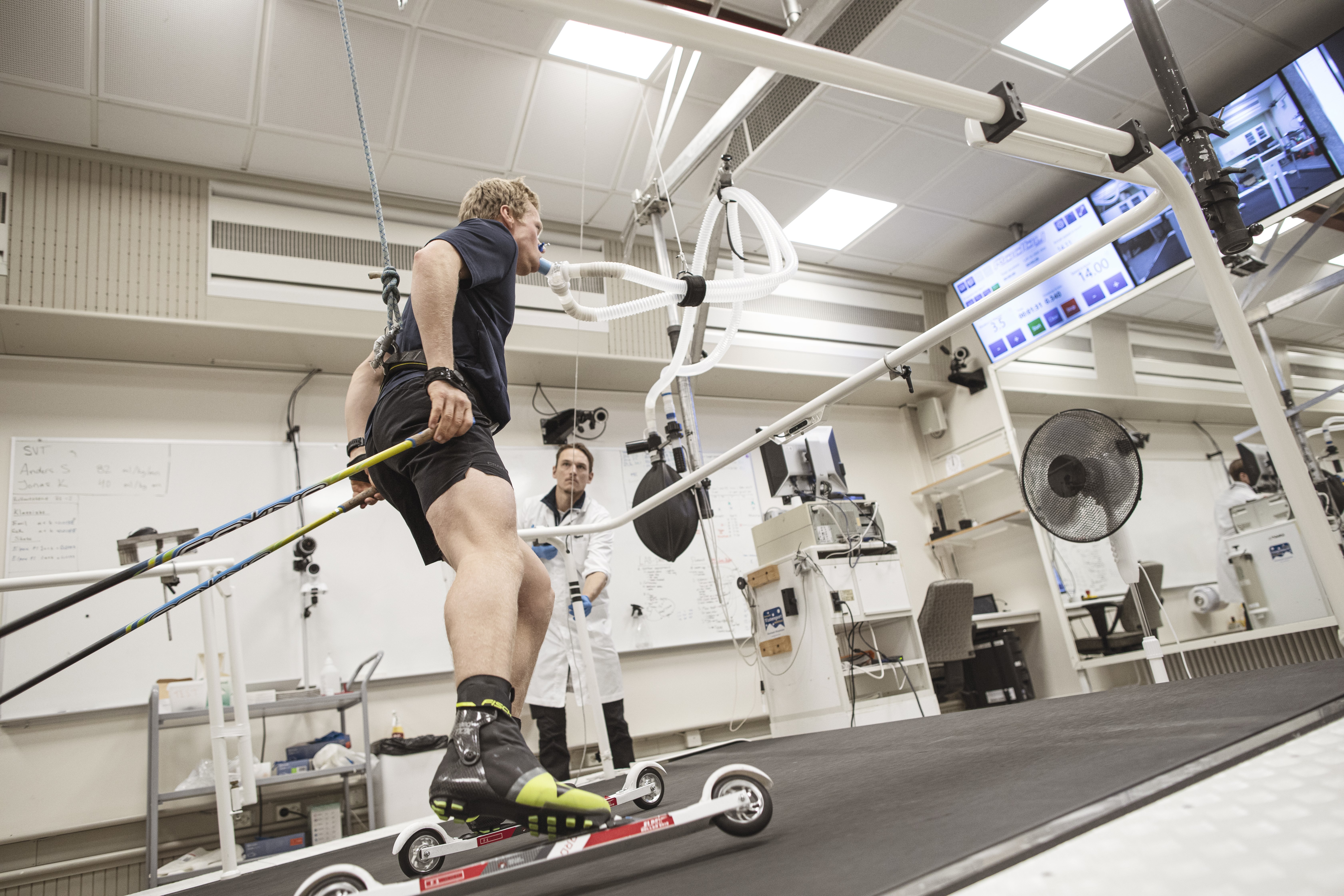Alfred Buskqvist åker rullskidor på rullband med testutrustning som mäter syreupptagning, övervakas av testledare Hampus Lindblom.